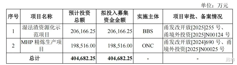 根据招股书披露,公司拟于深市主板发行新股募资40亿元,主要用于湿法渣资源化示范项目、MHP 精炼生产项目,这两个项目均位于印尼。