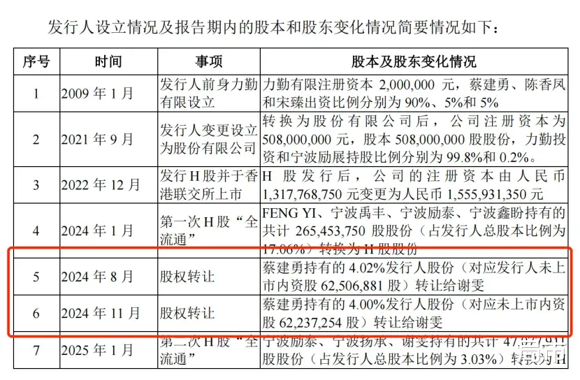 从交易发生的时间节点及定价水平看,该安排发生在公司申报上市前的关键阶段。值得注意的是,根据公司港股披露的2024年中期报告,报告期内双方仍为夫妻关系,谢雯被表述为蔡建勇之配偶;而在随后披露的2024年年报及2025年中期报告中,相关关系说明未再出现。