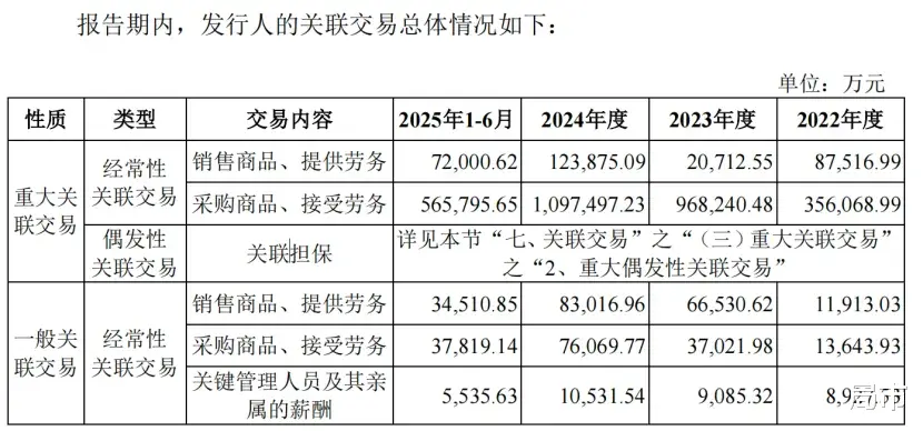 招股书显示,2022年至2024年,公司向关联方采购商品、接受劳务的金额分别为35.61亿元、96.82亿元和109.75亿元,呈持续上升趋势;2025年上半年,该金额进一步达到56.58亿元。上述关联交易主要发生在境外,其中以印尼关联方为主。