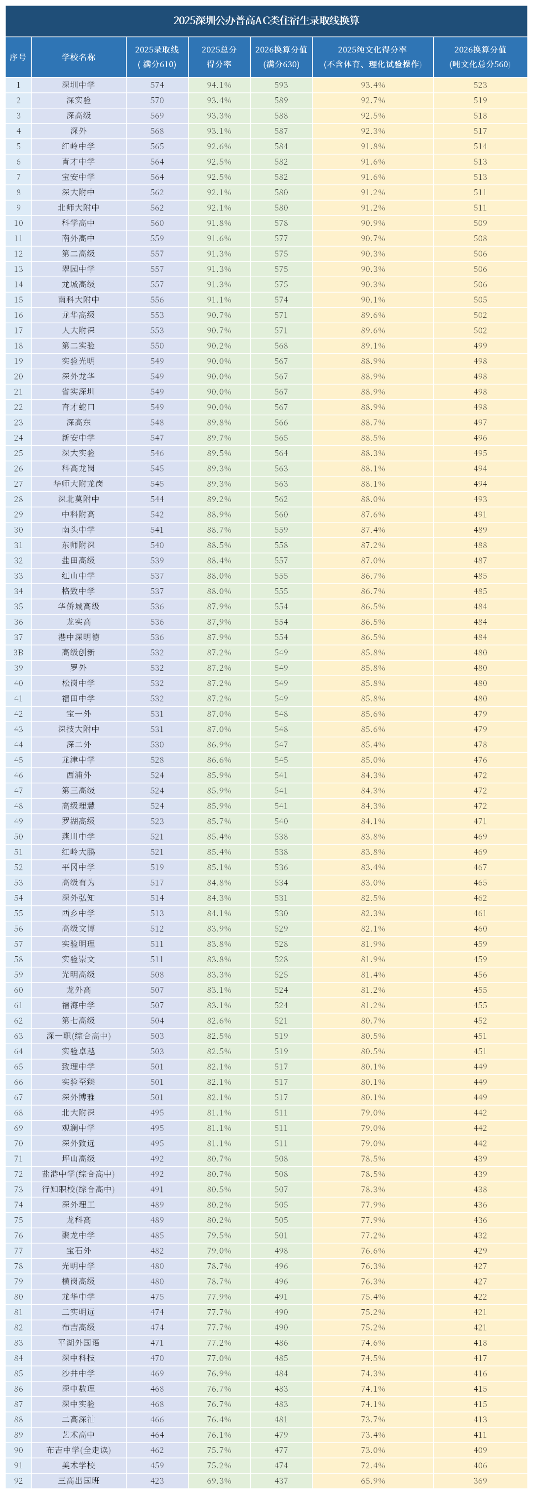 中考总分调整后,往年录取分数线已不能直接参考。以深圳中学为例,2025年AC类住宿生录取线为574分(满分610分),占总分的94.1%。如果不考虑体育和实验操作这两项通常能拿高分甚至满分的科目,2025年深圳中学AC类住宿生的纯文化得分率约为93.4%。