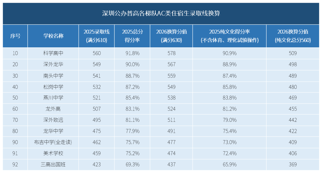 根据换算数据,深圳公办普高可大致划分为以下几个梯队,不同梯队对应着不同的得分率要求:头部学校(四大)要求纯文化得分率在93%以上,对应2026年文化总分需达到520分以上;前二十名学校则需要90%以上的得分率,文化总分500分以上。