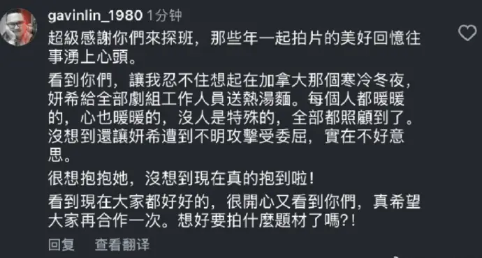 面对照片掀起的怀旧热潮,导演林孝谦亲自下场在评论区展开温情回应。他首先感谢老友探班的暖心举动,随后就当年沸沸扬扬的"深夜送面"绯闻作出正式澄清:"记得拍摄时恰逢寒流,妍希特意为全剧组准备了热腾腾的汤面,每个工作人员都有份。那份温暖至今难忘,没想到这个贴心举动却让妍希无端承受网络暴力,实在抱歉。"