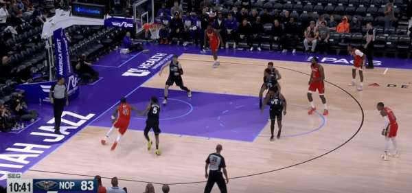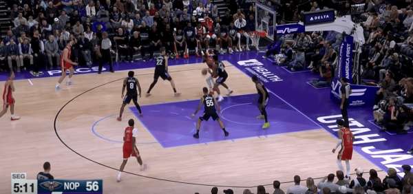 鹈鹕阵地战,弧顶小乔丹为默里掩护,低位琼斯为萨迪克贝做横向掩护到左侧要球,贝落位后单挑突破篮下对抗后上篮得分: