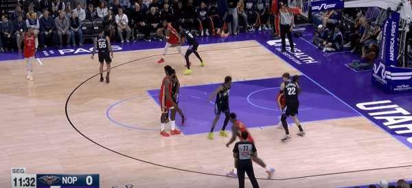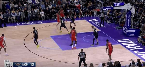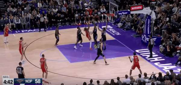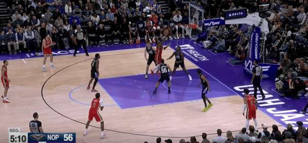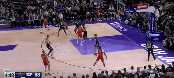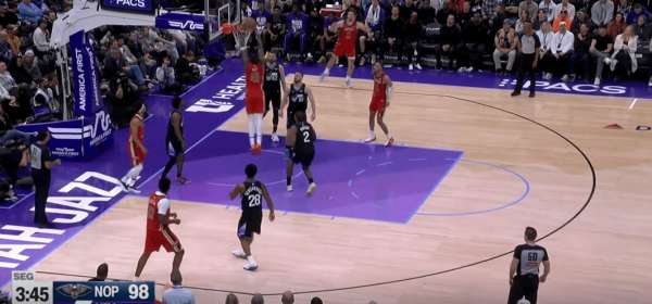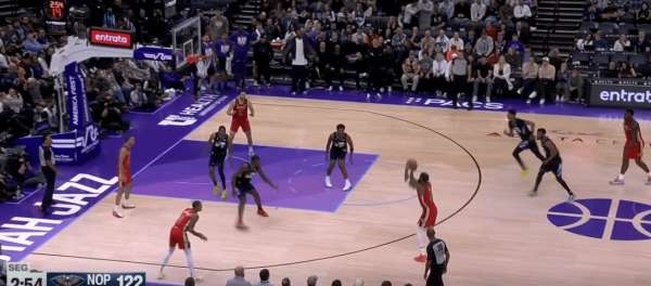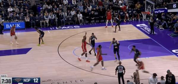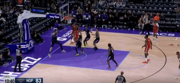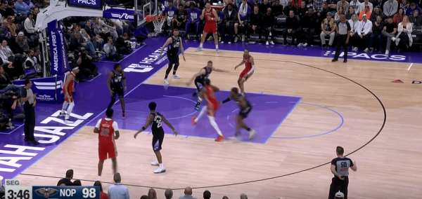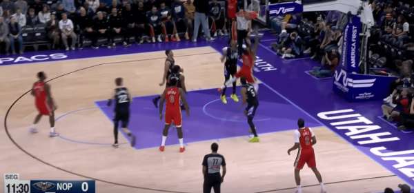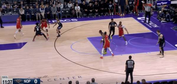 鹈鹕为贝多次做拉开一侧的背身单挑战术发起,这次接球后直接走左侧从底线突破,在协防下拉杆反篮打进: