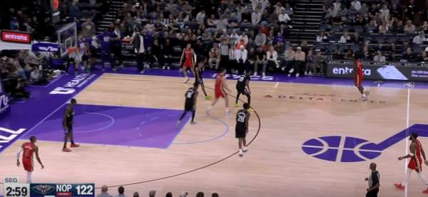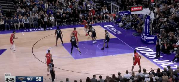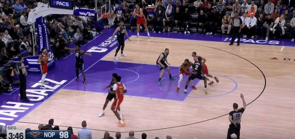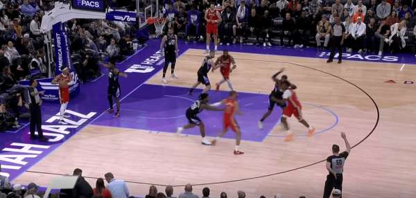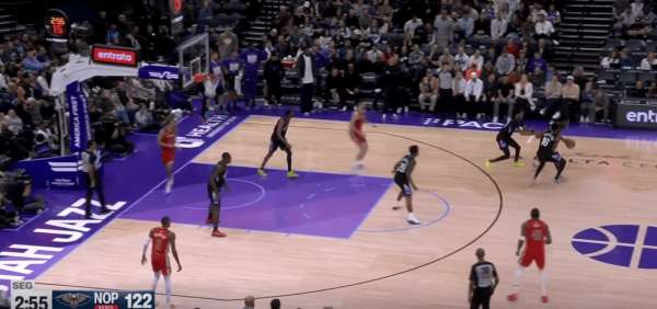 蔡恩右侧持球推进,马特科维奇掩护后爵士选择双人包夹,右侧防守回收中路控制出球线路,但右侧爵士低位站位放掉萨迪克贝,蔡恩出球给贝接应形成完全空位,后者三分命中: