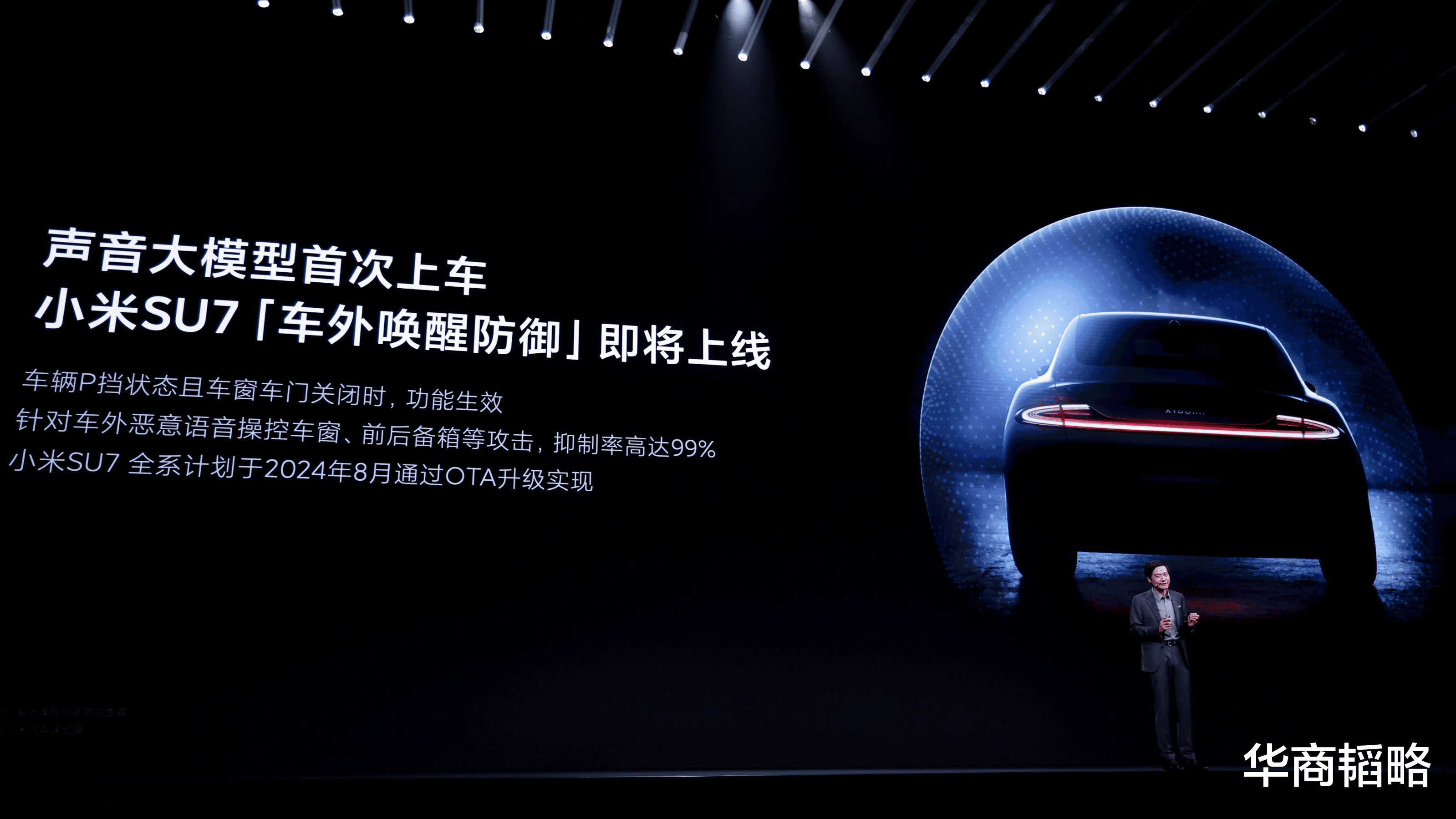 发布会上,小米自研的声音大模型首次亮相,它能实时识别自然界和生活中的各种声音,如婴儿哭声、水滴声,还能理解这些声音背后所处的环境和所表达的情绪。其中,声音大模型将应用到小米SU7上,带来创新的「车外唤醒防御」功能,它能够识别发声环境,无视车外的语音指令,让语音控车更安全,7月底将陆续升级。