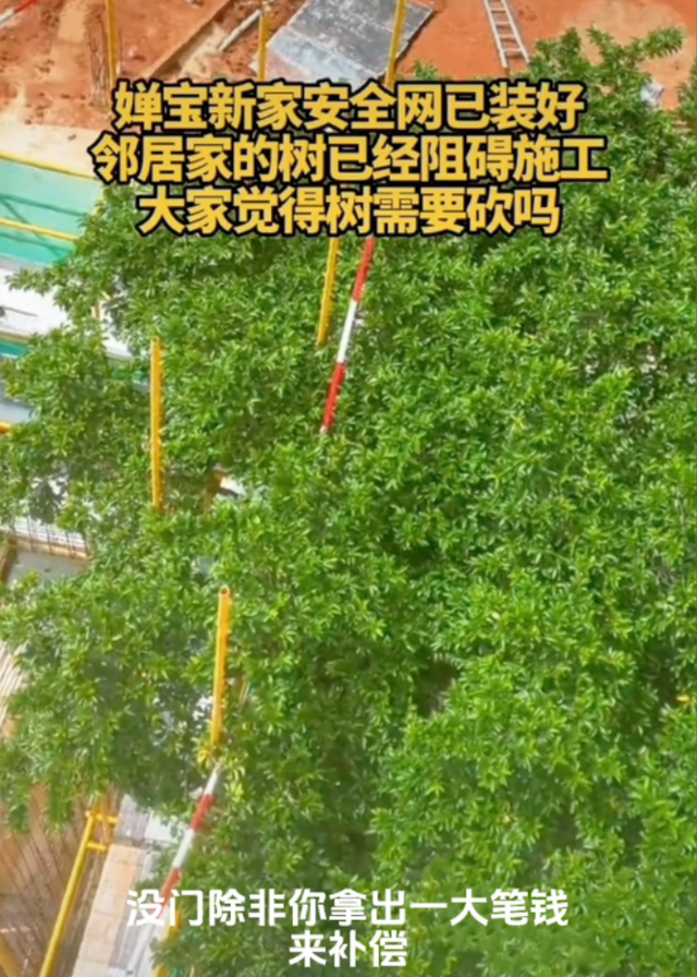 而从现场照片来看,这棵树确实有很大一部分挡住了禅宝家的楼,要往上继续施工,就只能砍树,别无他法。