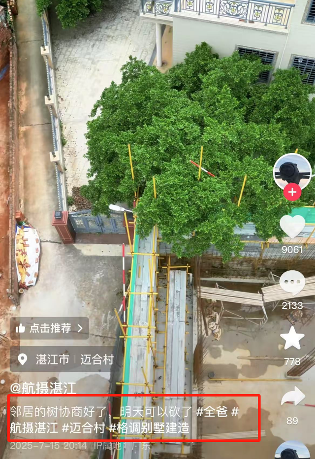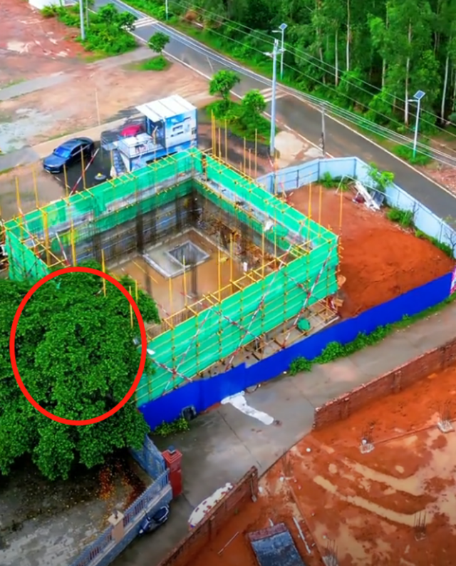 事情的起因是这棵树的树冠已经伸到了全家的宅基地范围。眼下房子才刚建到第一层,树枝就已经挡到了施工空间,要是盖到第二层三层,那干脆就是树中楼了。