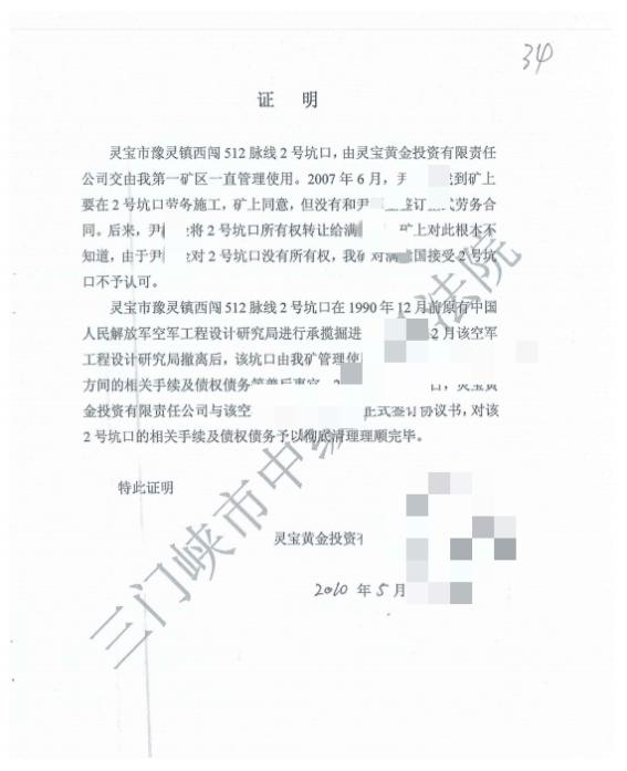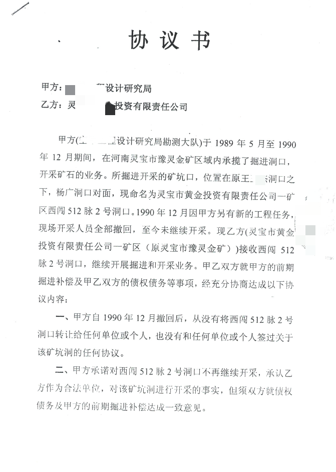 工程停工后,尹某金、藏某宏一方声称对该坑口拥有处置权,并向满某国出示了一份尹某金与灵宝市某黄金投资有限责任公司(下称 “金灵公司”)的 “承包合同”,要求满某国支付转让费用后方可恢复施工。在时任豫某灵派出所矿山治安部门负责人王某敬的协调下,2007 年 8 月 14 日,满某国与尹某金签订转让协议,当场支付 200 万元,剩余 50 万元出具欠款条。后续虽以矿石抵账 27 万元,但该欠条仍由尹某金持有。