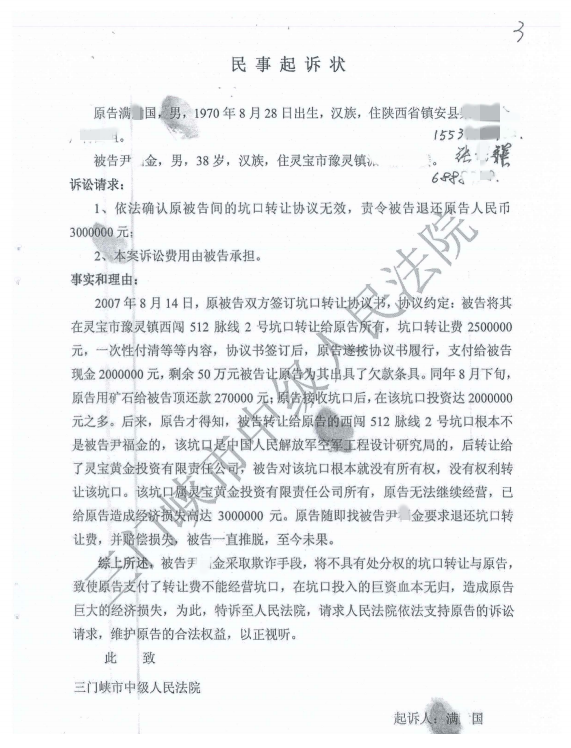 2008 年 3 月,满某国收到灵宝市法院传票,豫某灵镇村民王某学让以 “坑口所有权人” 为由起诉其侵权。诉讼期间,王某学让率人封堵 1 号坑口,关停设备、搭建工棚驻守,阻拦施工导致坑口停产,造成数十万元损失。满某国向王某敬反映未获处理,反而被建议支付 10 万元 “协调费”。