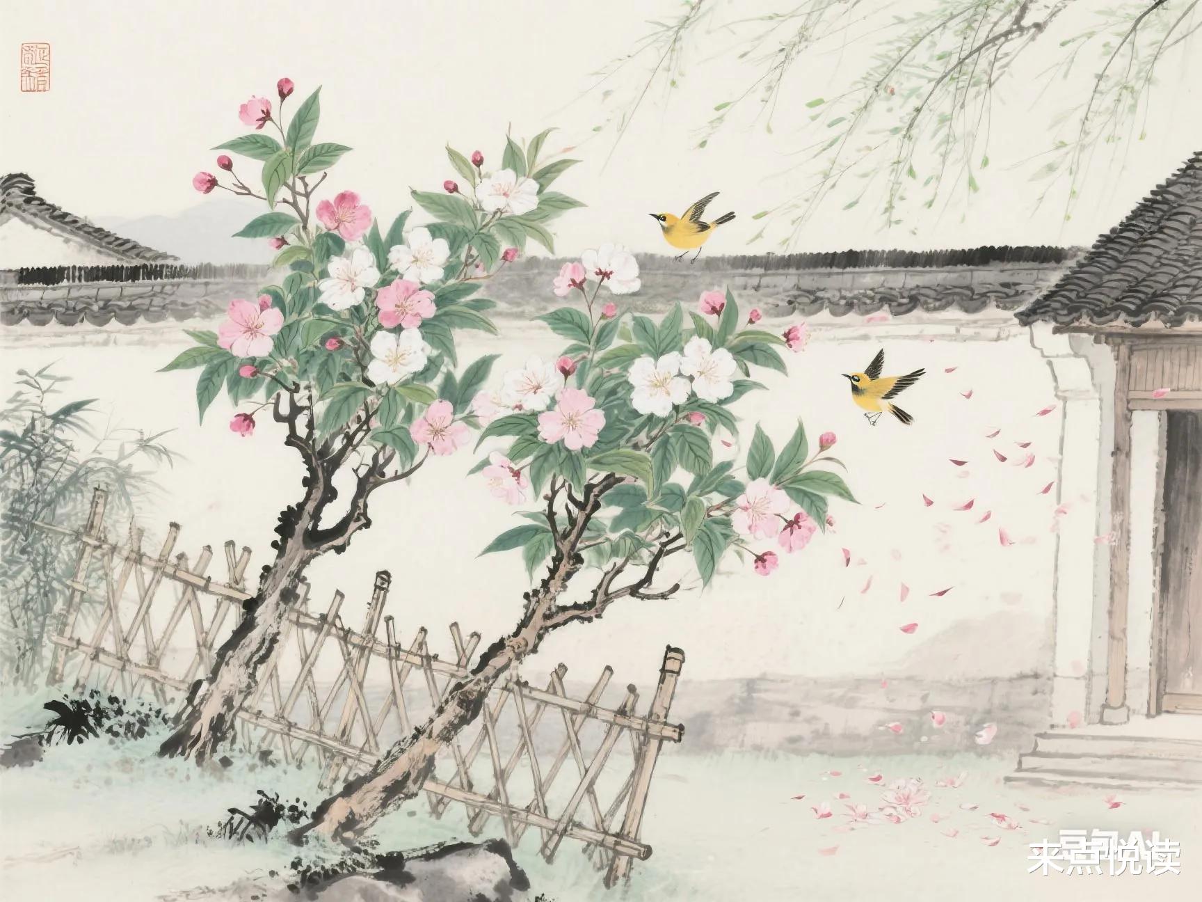 首句“两株桃杏映篱斜”,读到此句,脑海里不由浮现出这样一幅画面:春日和美的季节,普通的农家小院里,栽种有两株桃杏树,它们的枝干斜斜地伸展着,映衬在篱笆旁,显得格外妖娆。