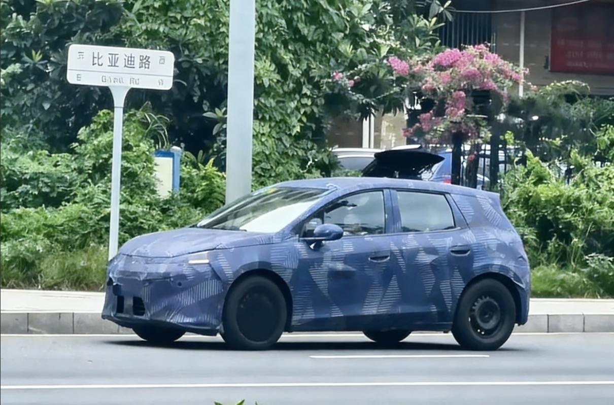 从谍照曝光背景观察,谍照出现的场景为深圳,旁边的路杆上标识了“比亚迪路”字样,前方车辆的牌照为明显的粤B。从新车谍照伪装程度观察,谍照整体覆盖着贴花,前风挡以及侧窗贴敷了反光膜,车灯以及进气口等局部有挖孔,不过仅仅为功能需要。此外,谍照轮圈为黑色钢圈,几乎可以肯定是替补,真正的轮圈造型尚在保密之中。A