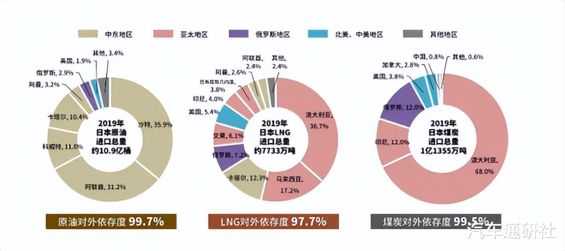 最后,日本的先天资源情况并不具备大力发展电动车的条件。在2019年时,日本石油、液化天然气、煤炭的对外依存度分别高达99.7%、97.5%和99.3%。能源自给率极低,十分依赖进口,尤其是中东地区的补给。