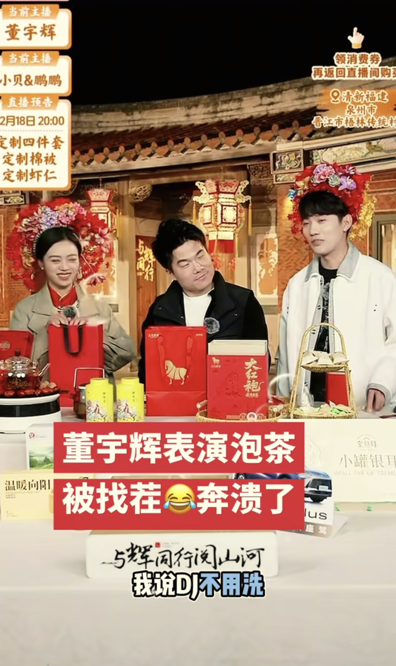 先是宇辉展示泡岩茶时竟然也去做了洗茶的步骤,但直播间的在线网友看到后却有人留言提示说“岩茶不用洗茶,宇辉操作错了”,于是搞得刚洗完茶的宇辉只好尴尬捂脸,表情更是有点崩溃。