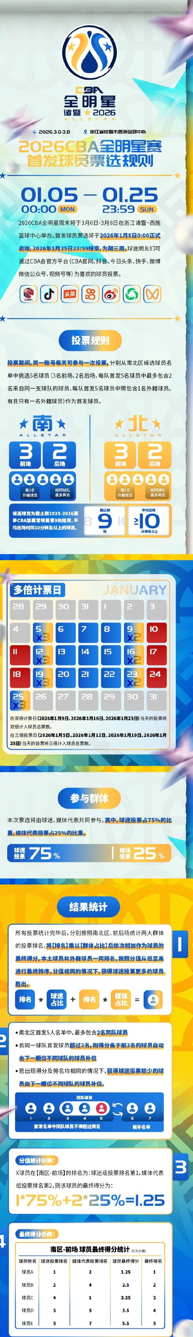 上当是新赛季CBA全明星投票规则,CBA官方上午发文写道:“CBA全明星周末再临诸暨!2026CBA全明星赛首发球员票选通道将在1月5日0点准时开启!每日可进行1次投票,每日0点刷新投票机会,投票截止于2026年1月25日23:59:59!”因为在这个界面不能发布二维码,所以我会把投票的二维码放在评论区置顶。喜欢曾凡博的球迷可以关注一下1月1日他的上场时间,如果能够上场超过10分钟,那小曾还是有资格获得投票机会的,毕竟本牌九啊耽误了太长的时间。