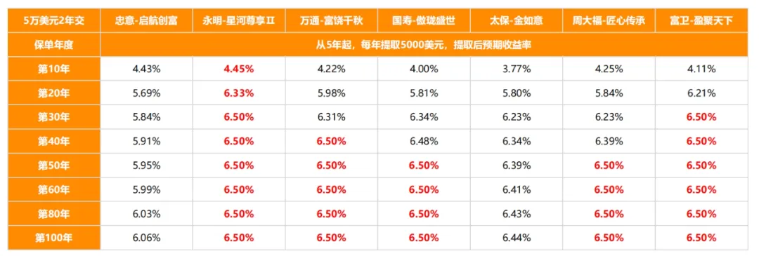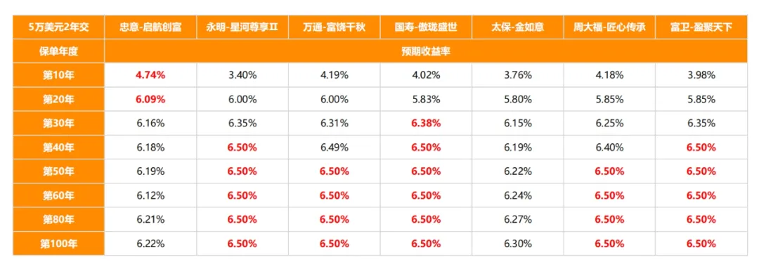 咱们继续看预期收益,永明、富卫、万通的表现都差不多,四十个保单年,收益率基本可以达到天花板6.5%。