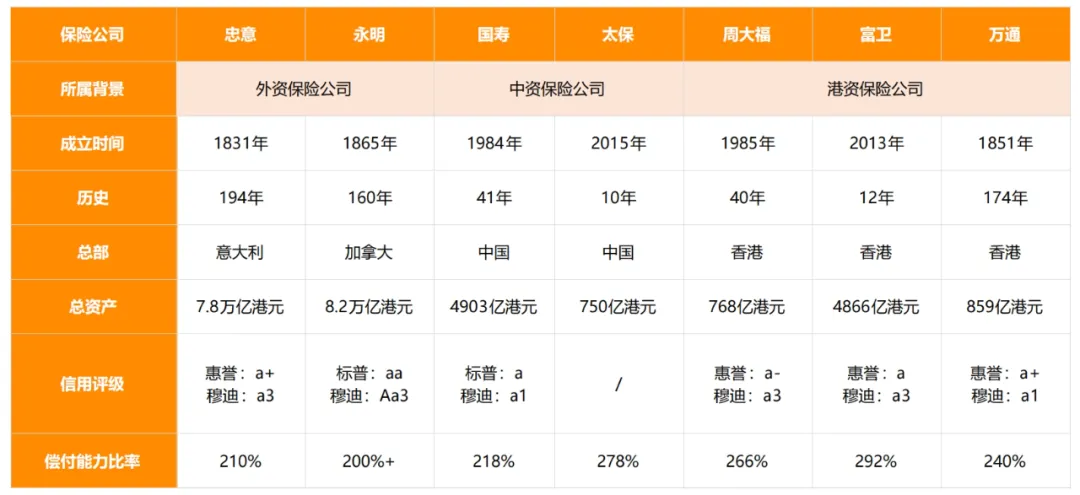 我特意梳理了7款2年缴产品背后的香港保险公司的历史背景、财务实力、信用评级和偿付能力充足率。