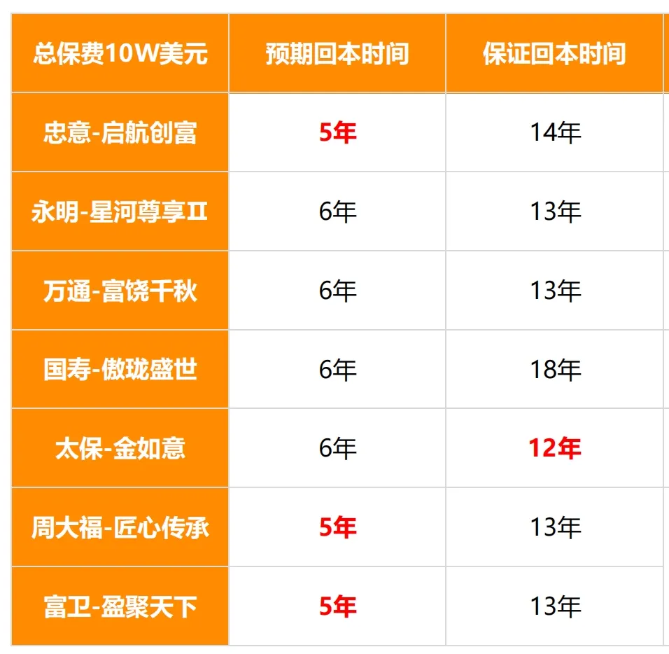 想早点回本,投资风险偏好较低可以选择太保-金如意,12年保证回本,但总收益率比不上其他产品;