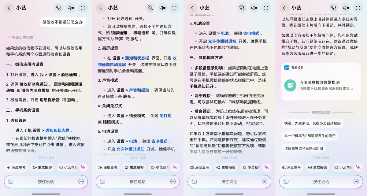 如果漏掉微信通知,说不定就是设置出问题了。最快的方法是直接唤醒手机里的小艺助手,对它说“微信收不到通知怎么办”。它会给出详细的排查步骤,比如检查通知权限、电池优化设置等,跟着照做就能轻松解决,点击其中的蓝字还能直接跳转到对应的设置项,超方便。