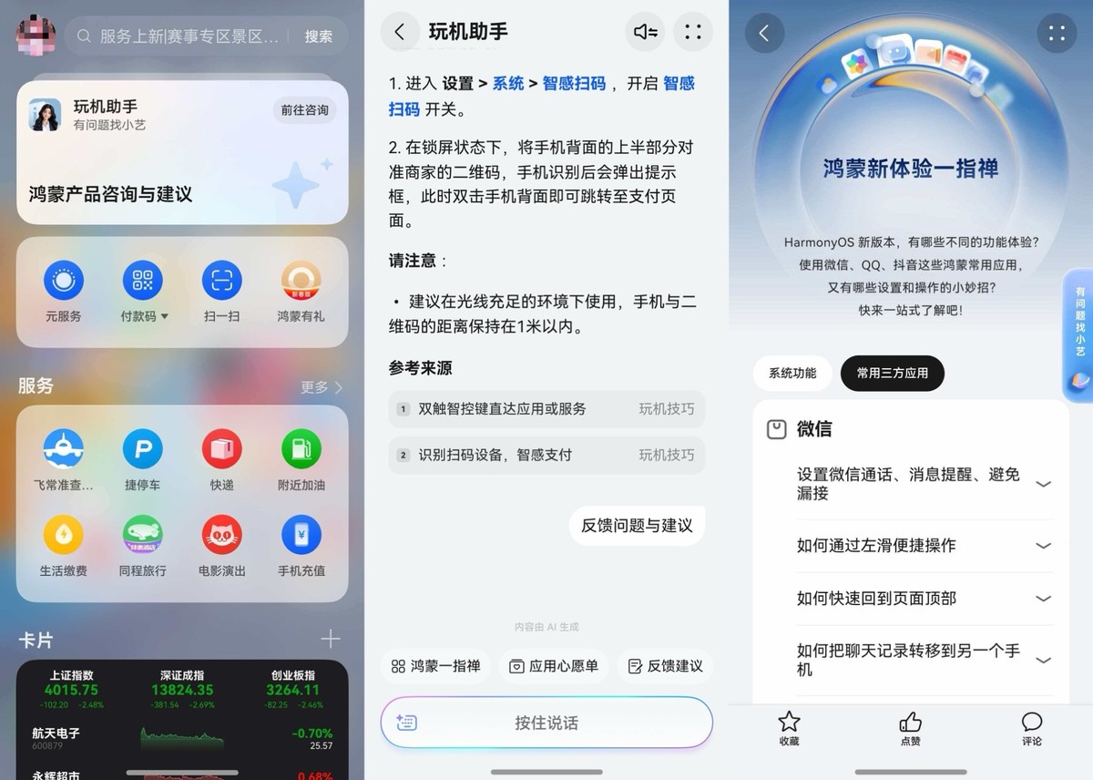 如果在使用过程中还有其他微信使用问题,在桌面右滑进入“负一屏”,找到“鸿蒙产品咨询与建议”卡片,进入“玩机助手”界面。下方的“鸿蒙一指禅”板块,就整理了包括微信在内常用第三方应用的操作攻略,随时提供帮助。