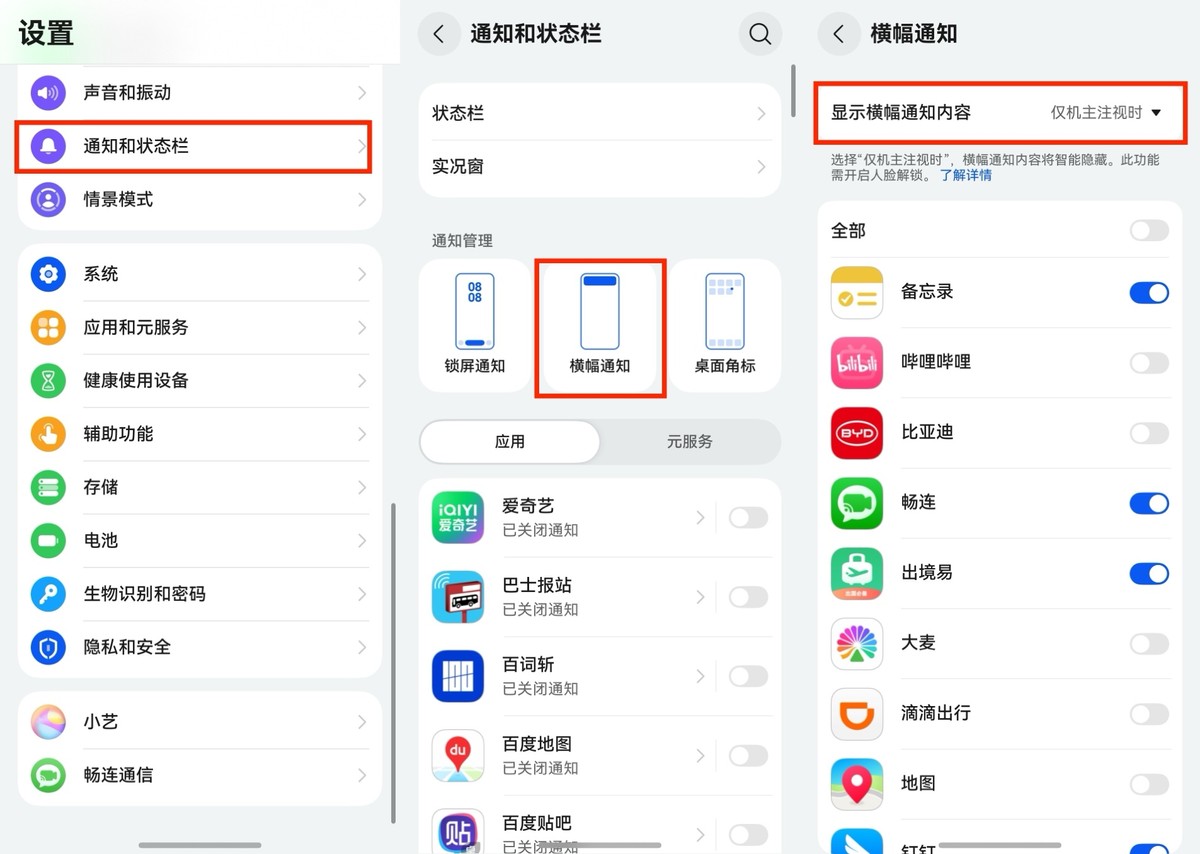 还有一个终极办法,可以进入系统【进入通知和状态栏】-【横幅通知】,设置“仅机主注视时”,如果有别人在看你的屏幕,通知内容将智能隐藏,这样就不用怕隐私被泄露了。