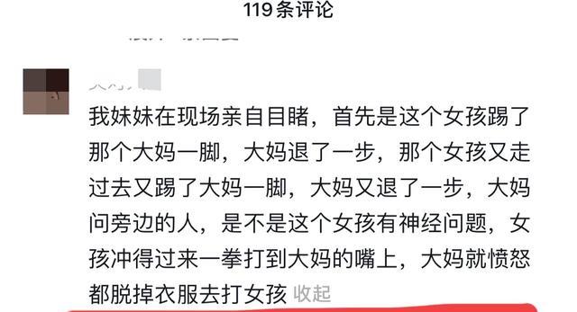 有人说我妹妹在现场亲自目睹,首先是这个女孩踢了大妈一脚,大妈退了一步,那个女孩又走过去又踢一脚大妈又退了一步,这是大妈疑惑的问旁边的人,这个女孩是不是精神有问题,女孩冲过来一拳打过去,正好打在大妈的嘴上,这回大妈就怒了,准备脱掉衣服“大干一场”!不知道真假,但好几个人这么说了!