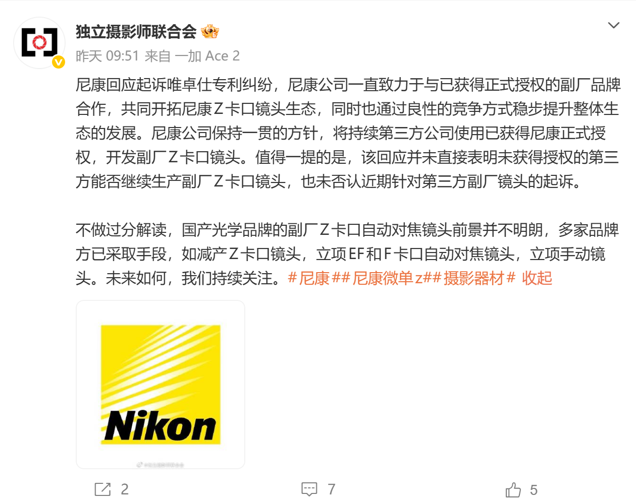 据海外影像权威媒体DPReview报道,尼康近日就“是否对国产镜头品牌唯卓仕采取法律行动”一事作出回应。不过,其回复内容仍保持高度谨慎的公关口径,未直接证实或否认诉讼传闻,颇有几分“话到嘴边留三分”的意味。