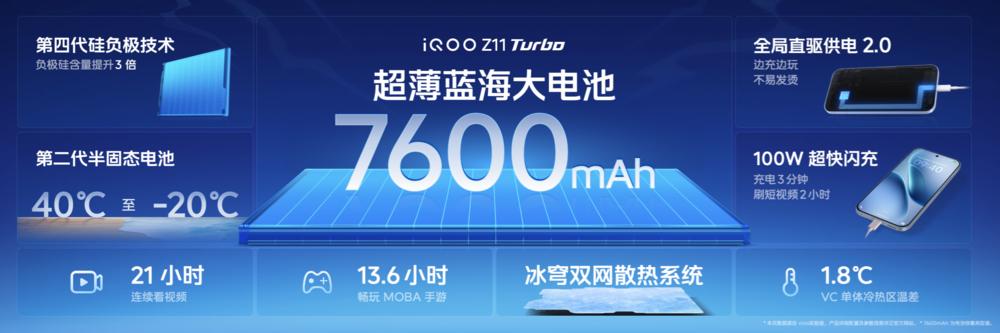 iQOO Z11 Turbo内置7600mAh超薄蓝海大电池,采用行业领先的第四代硅负极技术,能量密度达iQOO全系最高的860Wh/L,续航能力远超同尺寸性能机。配合100W超快闪充与全局直驱供电2.0技术,边玩边充不发烫、不伤电池,一杯咖啡的时间即可回血过半。