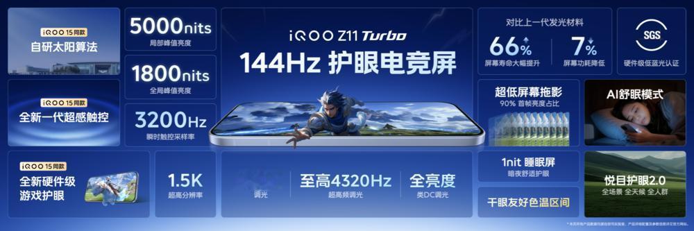 iQOO Z11 Turbo配备6.59英寸1.5K 144Hz护眼电竞屏,支持类DC调光、至高4320Hz超高频调光、全亮度类DC调光三重护眼方案,通过SGS硬件级低蓝光与低频闪认证,实现全天候、全人群、全场景护眼。