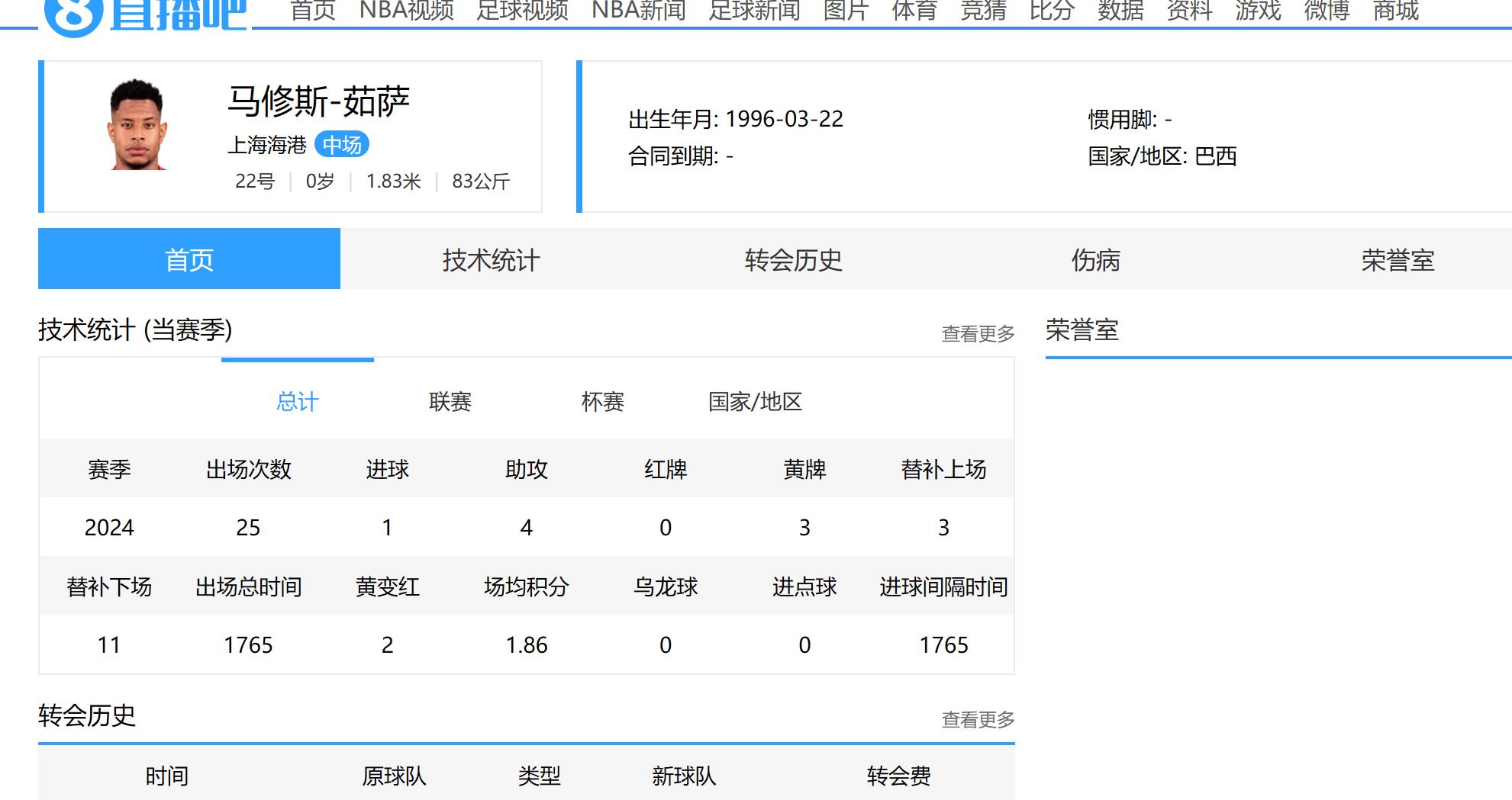 看看第三方的数据统计,巴西外援茹萨在2024赛季,总共出场25次,有1个进球,还有4个助攻, 替补上场3次,替补下场11场, 总共1765分钟,从这个数据来看,茹萨才是上港的天命人,就好像黑神话悟空一样神勇无比!