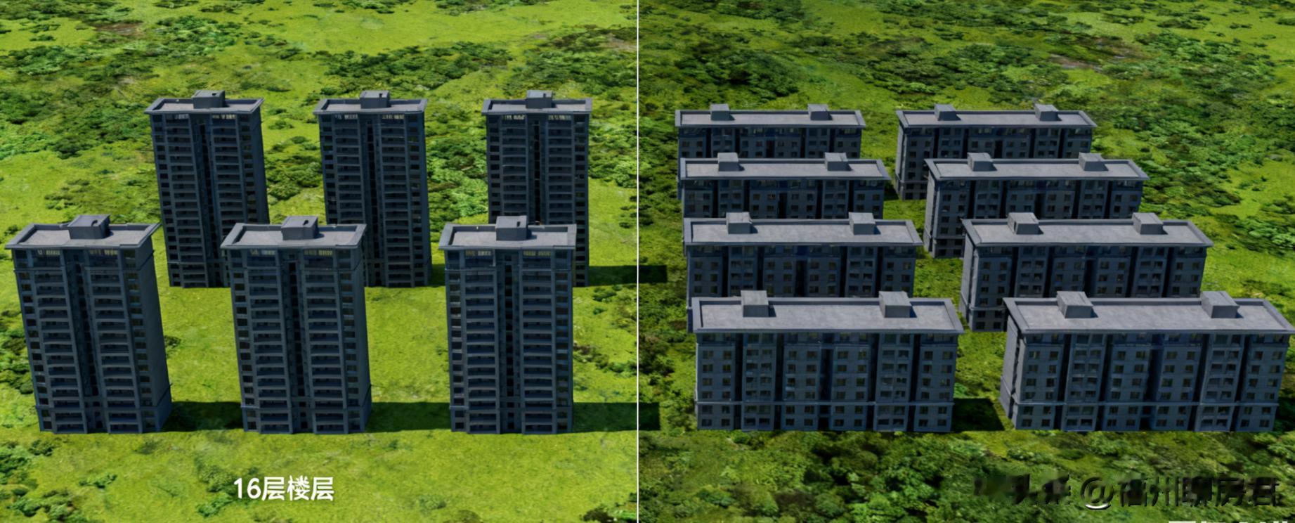 比如说同样大小的地块,左图里盖六栋小高层,社区就能留下比较大的活动空间;