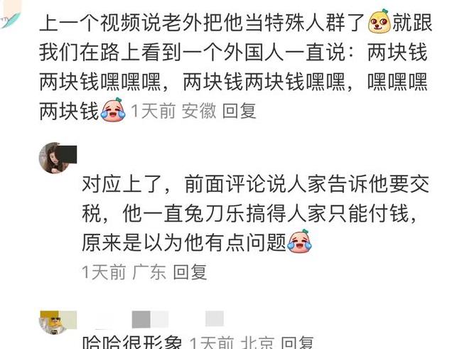 有网友说,有次路过的人和他说他需要交税,结果他无限重复“突刀乐”,搞得人家除了付钱不知所措。