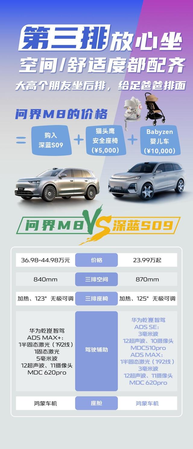 作为一个家有俩娃的上班族,平时周末总爱带着一家人去周边露营,节假日也会安排长途自驾,所以换一辆空间宽敞、坐着舒适又安全的六座SUV成了我近期的目标。在选车过程中,身边不少朋友推荐某界 M8 MAX,说它的鸿蒙座舱很智能。而深蓝S09四驱Ultra + 高定版则是我在逛车展时一眼相中的,这两款车价格相近,又都是主打家庭用车,自然成了我重点对比的对象。