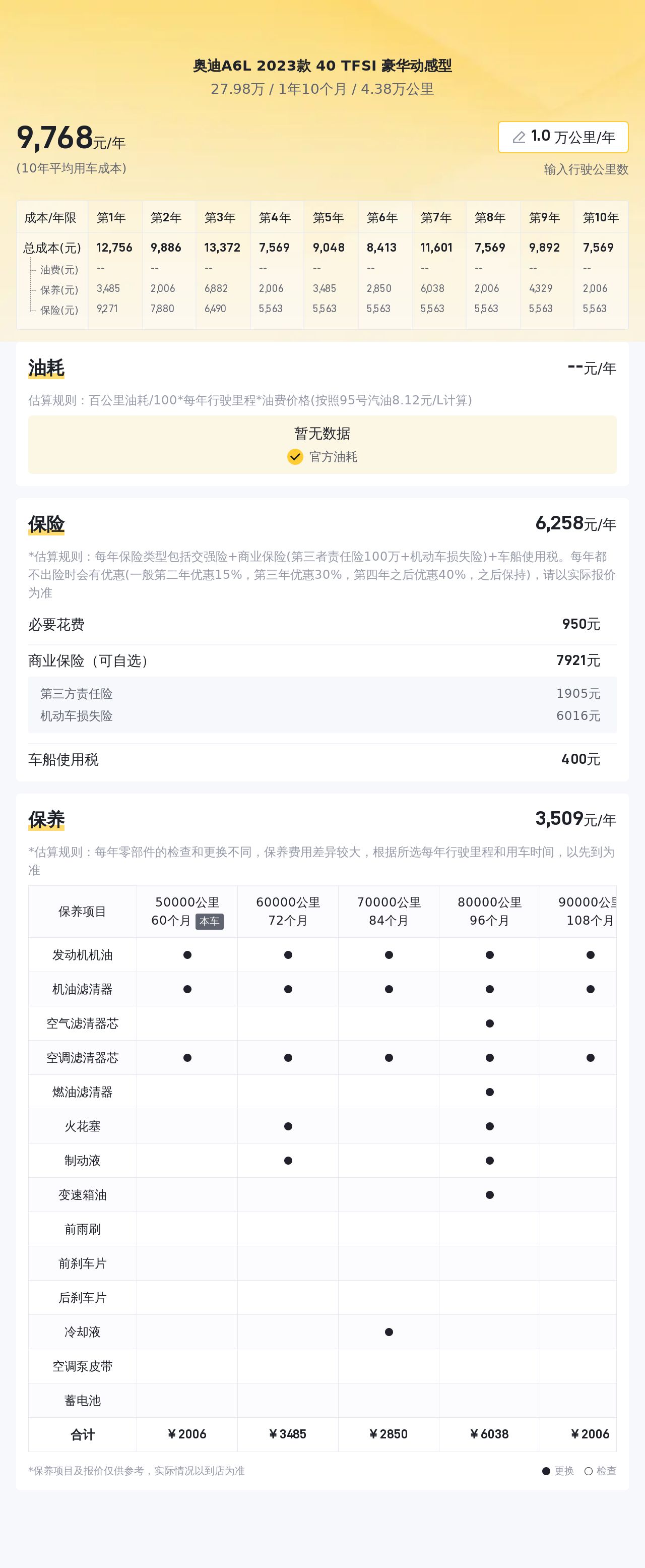根据相关数据,奥迪 A6L 2023 款 40 TFSI 豪华动感型的 10 年平均用车成本大约在每年 1.4 万元左右。这一成本涵盖了燃油、保险以及保养等方面的费用。其中,燃油费用大约为每年 6609 元,保险费用约为 5538 元,而保养费用则相对较低,约为 1100 元每年。值得一提的是,奥迪 A6L 2023 款 40 TFSI 豪华动感型采用了 2.0T 直列 4 缸涡轮增压发动机,搭配 7 挡湿式双离合变速箱。这种动力组合在保证驾驶乐趣的同时,也具有较为经济的燃油消耗表现。因此,尽管作为一款豪华车型,奥迪 A6L 2023 款 40 TFSI 豪华动感型在日常使用中的成本并不像人们想象中那样高昂。其适中的用车成本,使得它成为了一款既豪华又实用的车型选择。