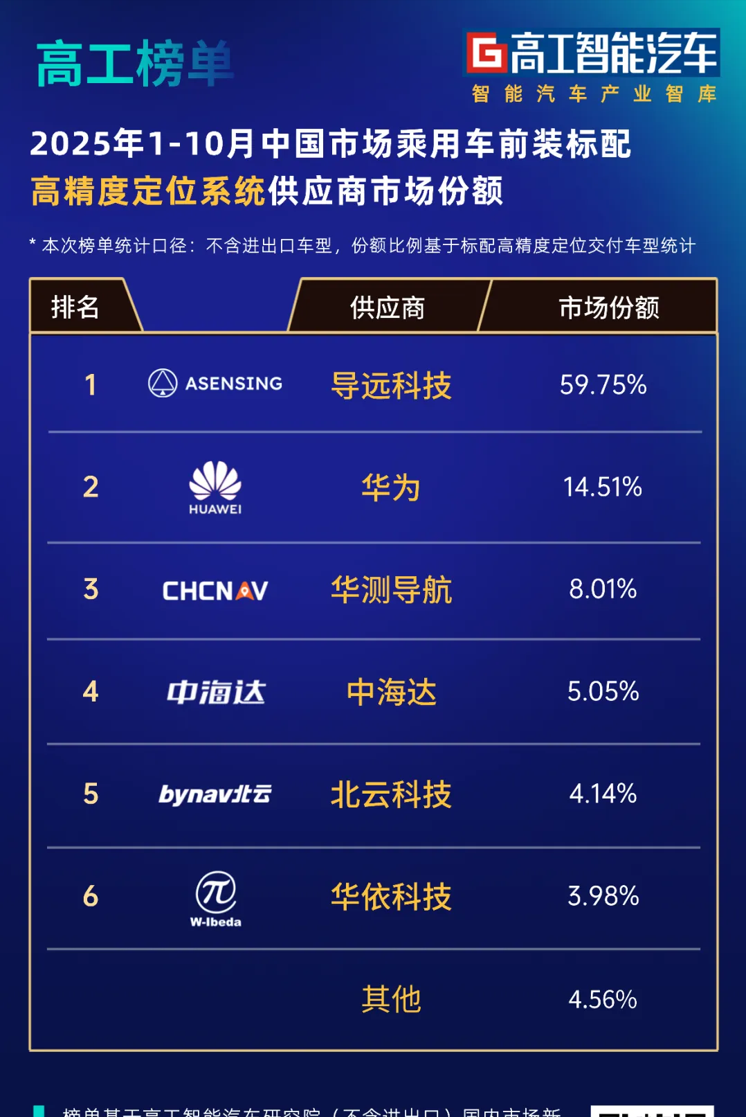 在高精度定位系统供应商方面,国内车载高精度定位市场呈现“一超多强”的竞争格局。从市场份额看,2025年1-10月,导远科技在国内车载高精度定位市场以59.75%的市占率稳居TOP1地位,华为和华测导航分别以14.51%和8.01%的市场份额位居第二、三位,中海达、北云科技、华依科技单体市场份额均低于6%,与头部厂商仍存在显著差距。