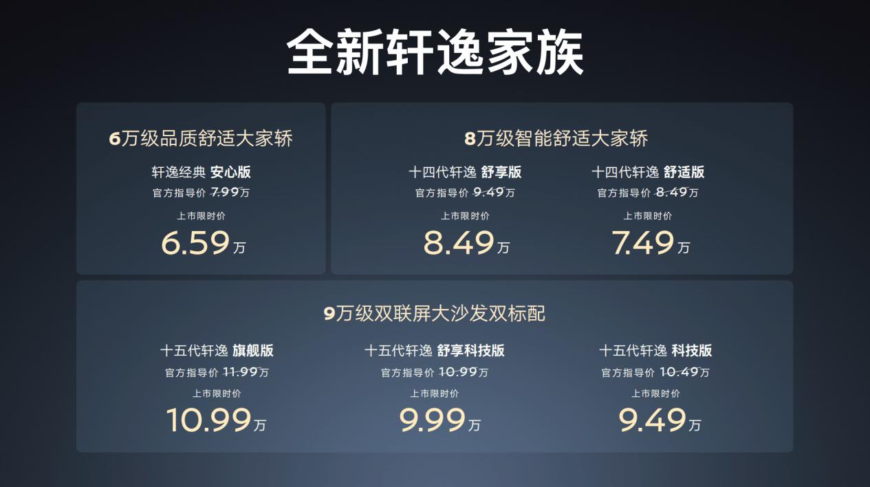 十五代轩逸本次共推出3款车型,上市限时价为9.49万元至10.99万元。外观采用V-Motion 3.0设计语言,提供“光翼”与“星翼”两种前脸造型及五种车色。车身尺寸为轴距2712mm、车宽1825mm,后备箱容积为572L。