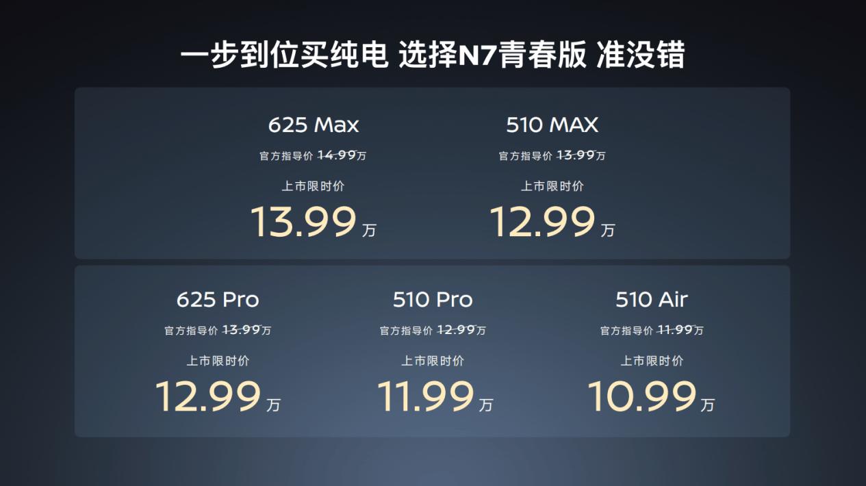 N7青春版上市限时价为10.99万元至13.99万元。外观沿袭“极简至美”设计语言,新车依托2915mm的长轴距,打造83%得房率。新车配备15.6英寸2.5K显示屏、高通骁龙8295P座舱芯片及910W音响系统。搭载Momenta一段式端到端智能驾驶辅助系统。座椅采用AI零压云毯技术,并配备全域智能防晕车系统。