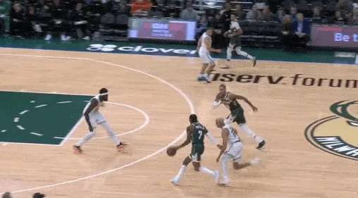 库兹马持球推过半场胯下变到左手后衔接小犹豫步启动左路突破,
