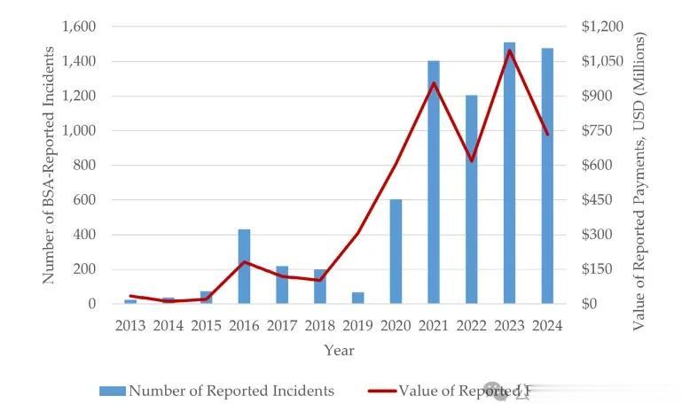 在三年审查期(2022年1月至2024年12月)内,FinCEN共收到7395份涉及4194起勒索软件事件的BSA报告,累计赎金总额超过21亿美元。