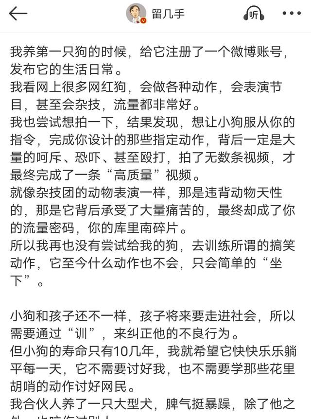 作为爱狗人士,他宁愿放弃任何流量,只希望狗狗们能快乐自在地生活。
