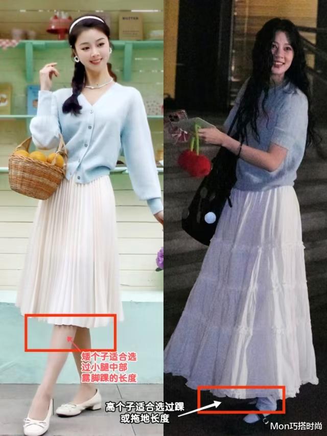 光是在版型上,赫本裙就比百褶裙优势更多。高腰线设计是赫本裙的标配,能直接拉长下半身比例,比多为常规腰线设计的百褶裙更能优化身材比例。