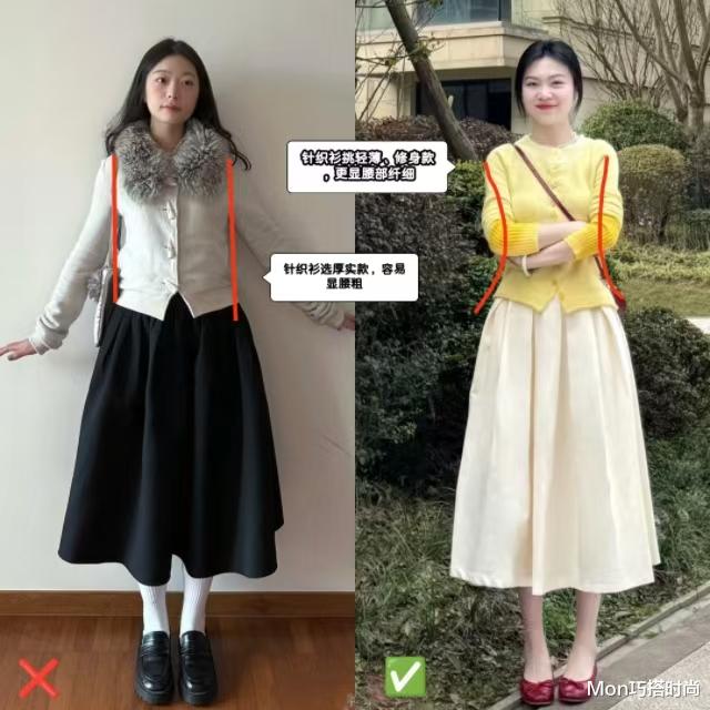 太厚实的针织衫或腰部太蓬松的伞裙,穿上瞬间胖一圈,大胸、厚背或上半身本就偏胖的姐妹更要远离哟~