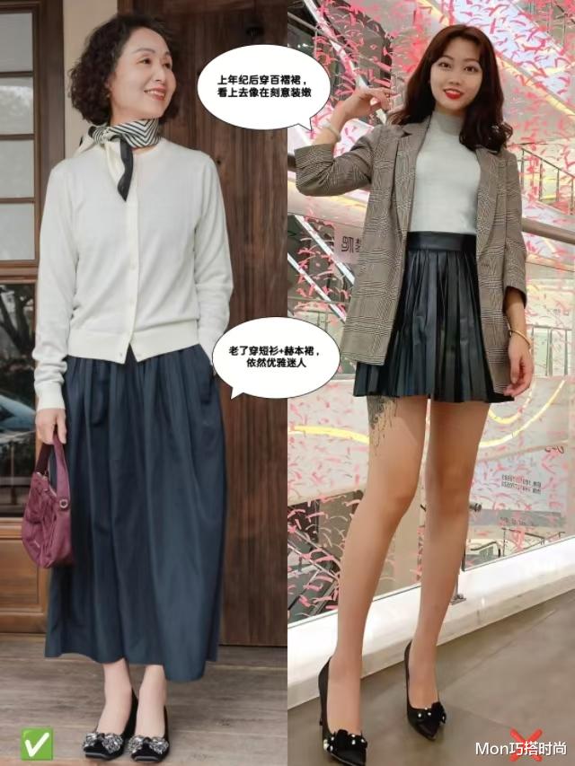 姐妹们也别忘了,百褶裙一直是学院风的代表,但上了年纪或长相成熟的人穿就像在刻意装嫩,极不协调!