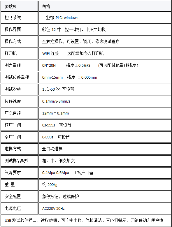 仪器采用点压法测量原理,结合激光无接触测量技术与高精度伺服控制技术,实现样品自动定位、压力精准施加、数据实时采集与智能分析,可高效完成卷烟和滤棒的硬度检测任务,为烟草生产企业、质量检测机构提供稳定、可靠、高效的检测设备,助力产品质量管控与工艺优化。