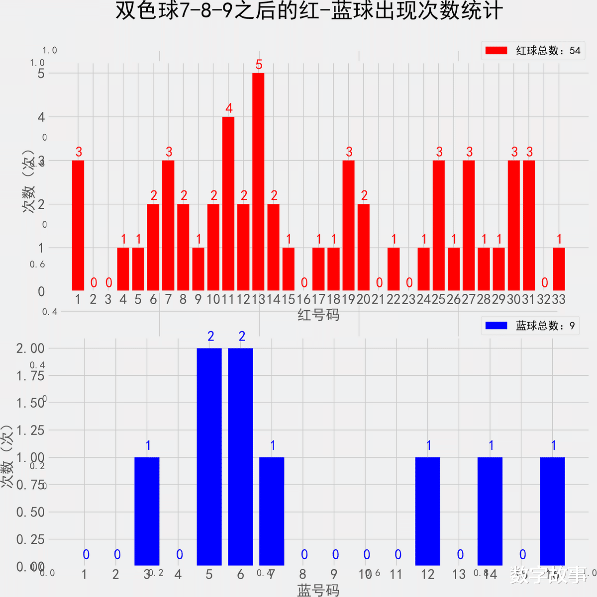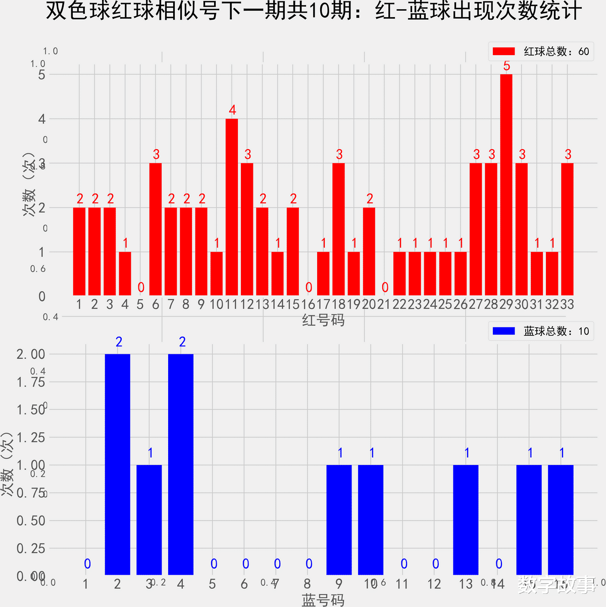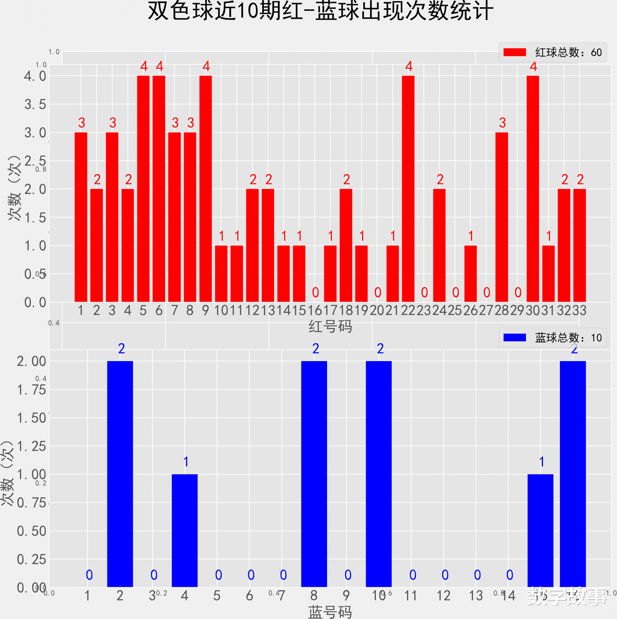 双色球近10期红蓝号统计情况统计样本数据: 60个红球 10个蓝球