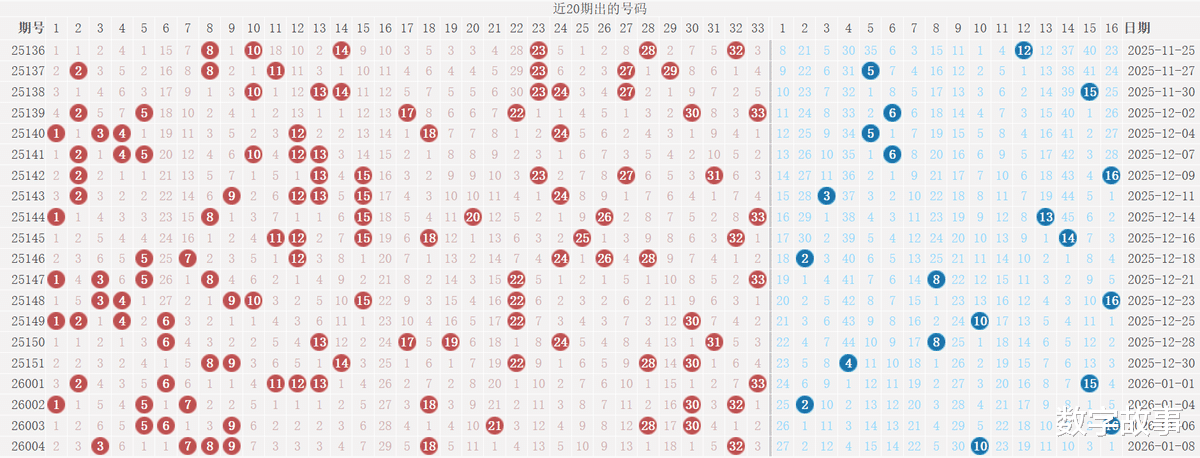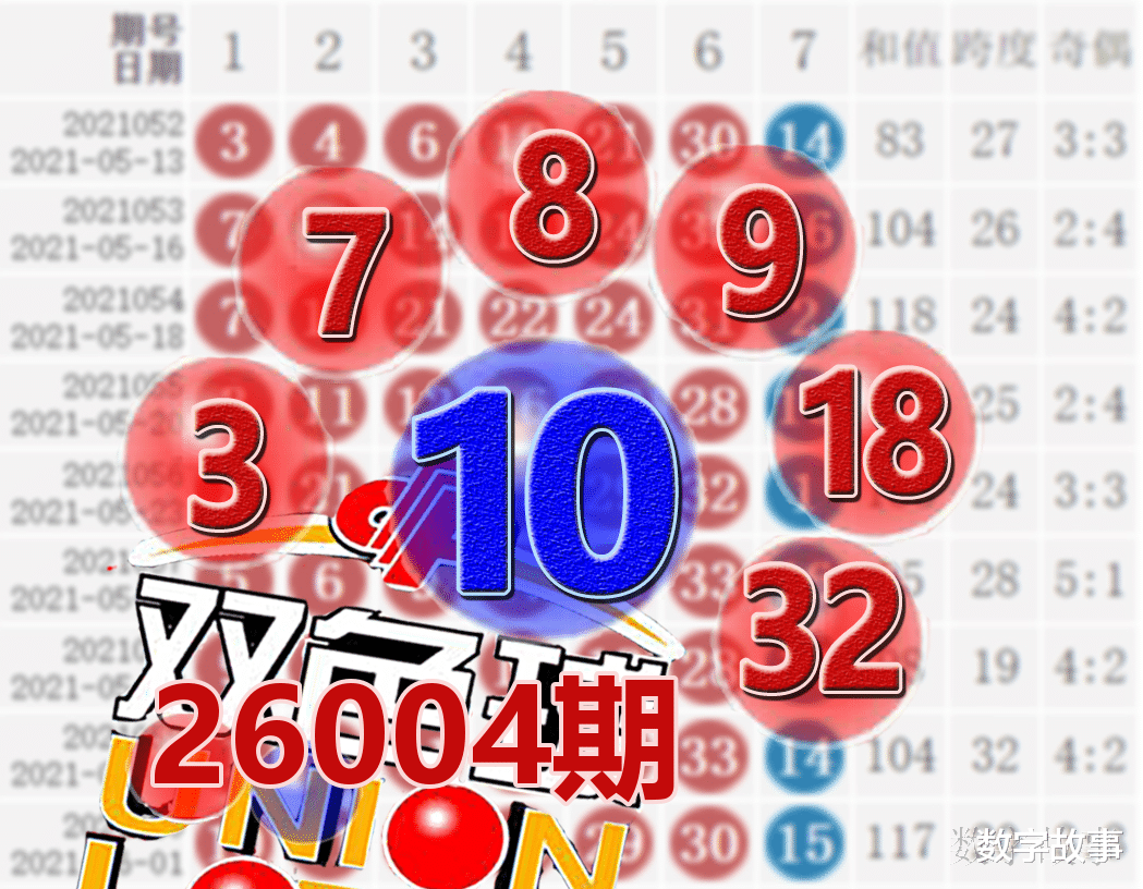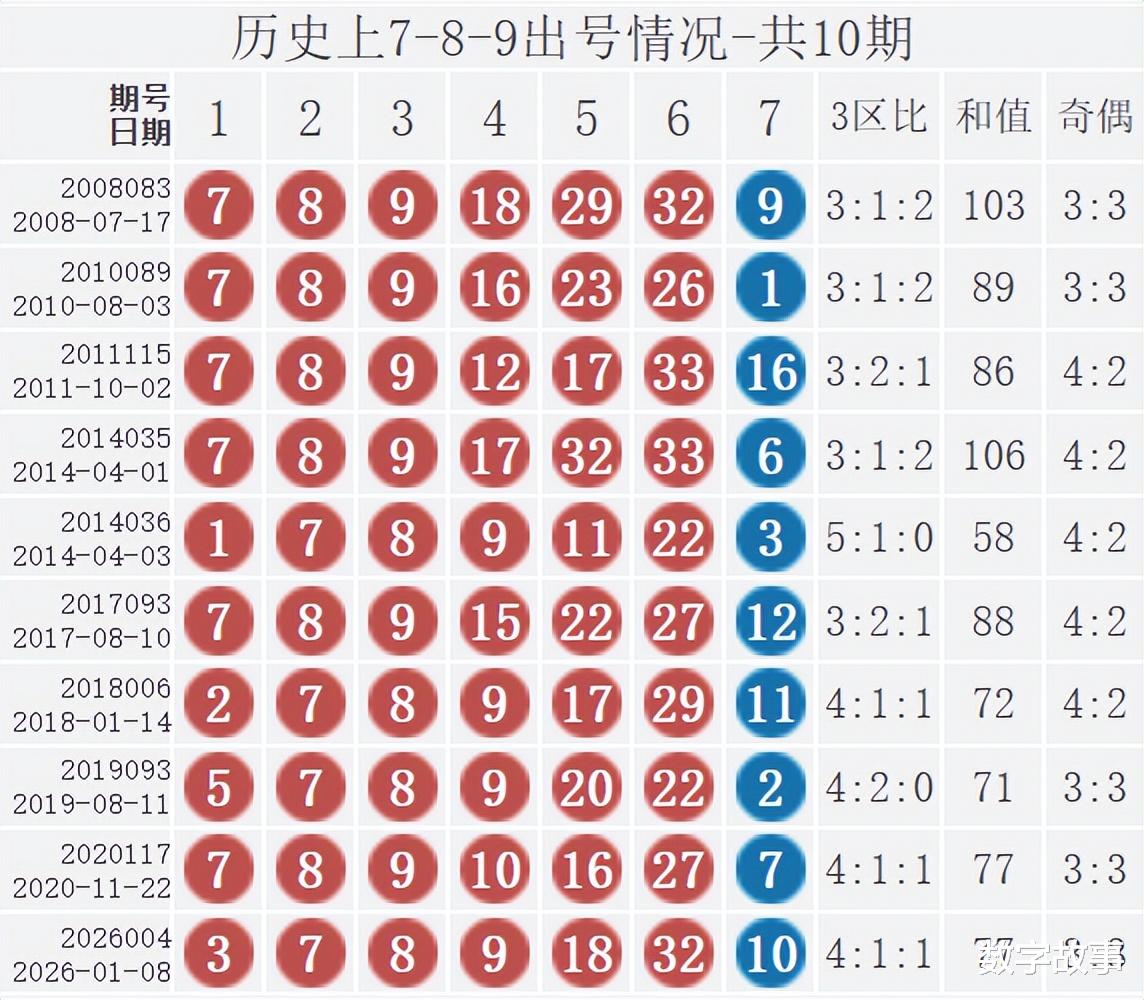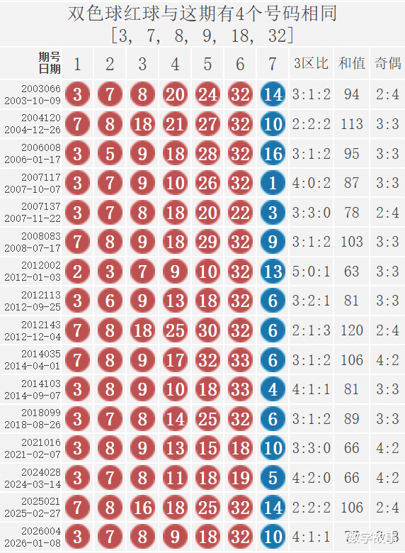 双色球2026004期红号在过去是否出现过?双色球2026004期红号: 3-7-8-9-18-32经查,历史上没有出现过与这一期6个红号一样的,5个红号一样的有1期,如下:
