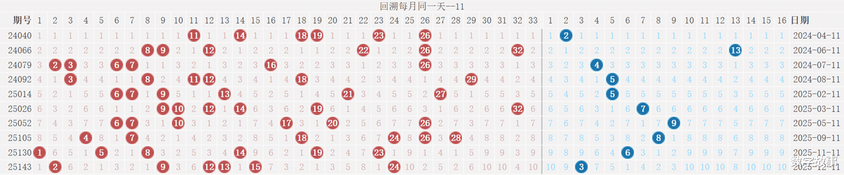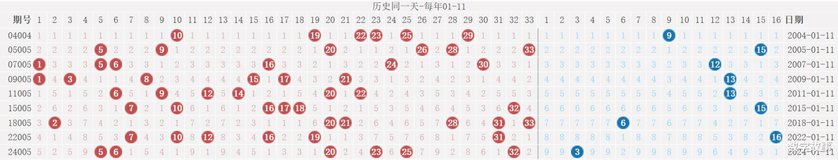 博弈心理,挑战概率: 看近期开奖号码,也可看历史数据统计!【双色球26005期多角度冷热号】双色球26005期四维走势图,红蓝号统计及冷热号1) 历史同一天: 01月11日 (共9期)