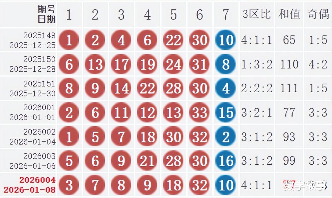 双色球26004期开奖结果及中奖情况:出奖时间: 2026-01-08 星期四 红球: 3-7-8-9-18-32蓝球: 10双色球红球重号叠码:9红球隔期下落:7, 18, 32红球奇偶比:3:3红球和值:77红球跨度:29 三区比:4:1:1连号: 7-8-9