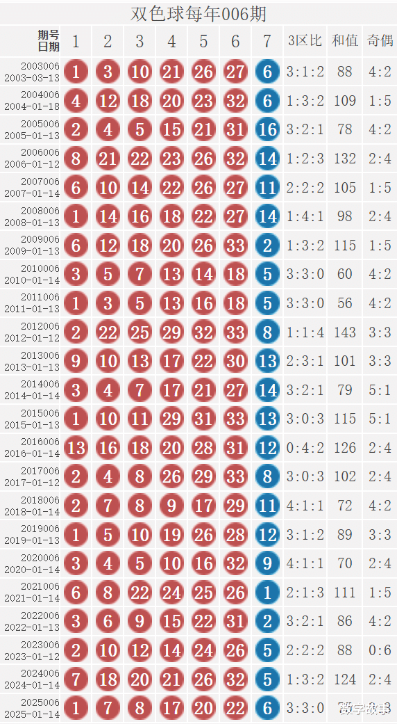 双色球每年006期的出奖号