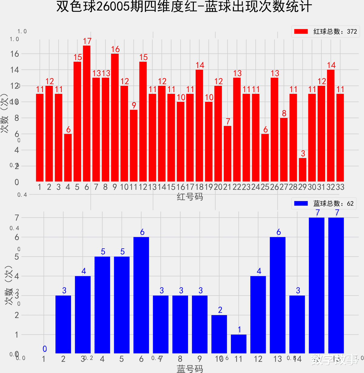 => 统计出现概率综合以上4个纬度的号码, 共62期根据出现的次数,分为热号,冷号,其他的为温号。统计样本数据:372个红球 62个蓝球